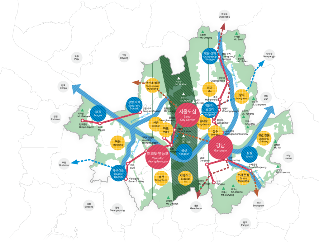 굳이 도심으로서의 강남을 살펴보는 데에는 이유가 있습니다. 도심 지역에 우선 적용되는 정책 때문이죠. 이를 테면 2040 서울도시기본계획에서 도심은 도심으로서의 기능을 잘 수행하도록 규제를 완화하고 복합개발을 유도하도록 천명하고 있습니다. 교통 측면에서도 도심으로 통근하거나 통학하는 사람들의 수요를 고려하지 않을 수 없고요. 따라서 강남 도심의 한 축을 형성하고 있는 영동대로 위 삼성역부터 봉은사역에 이르는 구간에 복합환승센터와 함께 5개 노선이 지나가도록 계획한 것은 우연에 의한 것이 아닙니다. 지하철 중에서도 강남을 지나는 노선이 부동산 시장에서 프리미엄 요소로 작용하는 것도 강남 도심의 영향과 밀접한 연관이 있고요.