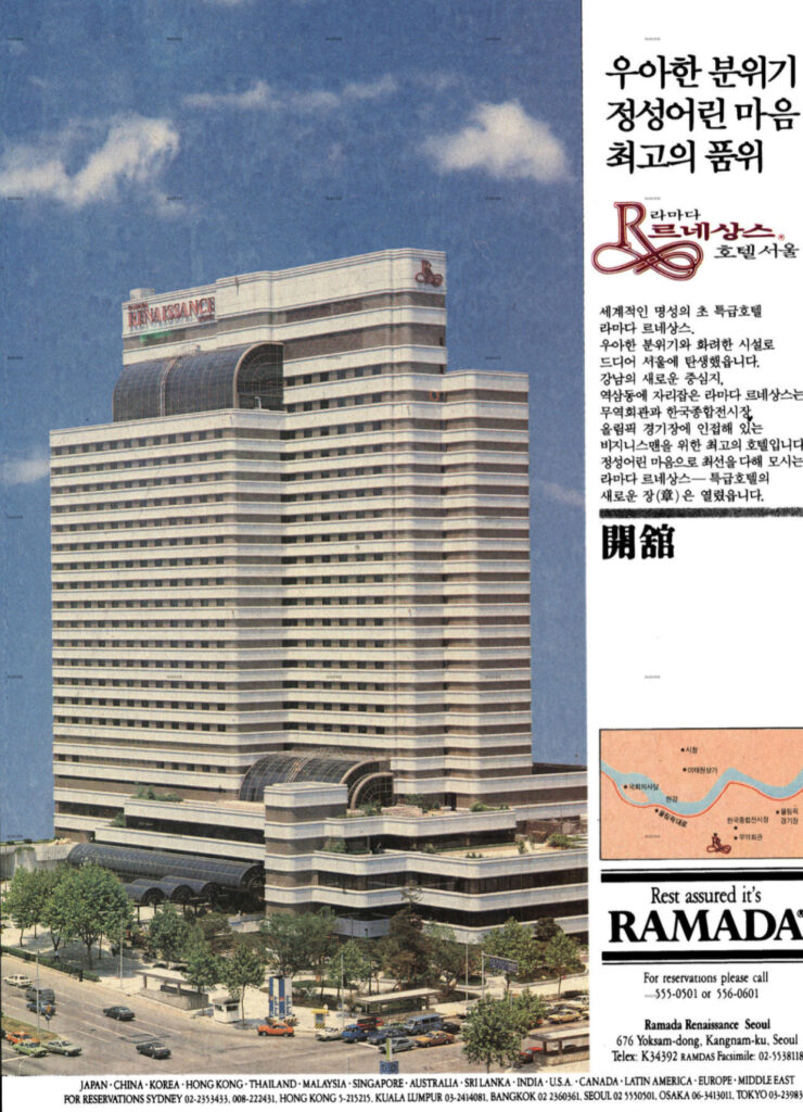 원래 이 부지에 있었던 라마다 르네상스 호텔은 테헤란로 중심에 자리하며 1988년 서울올림픽을 앞두고 개관했고 2016년 문을 닫았습니다. 국제 이벤트와 글로벌 관광객 유치는 물론, 입지를 활용해 테헤란로 기업들의 미팅과 출장자 숙소로 기능하며 업무 중심지로서의 강남 위상을 뒷받침했고요. 개관할 즈음의 광고를 보면 홍보 문구 중 ‘비즈니스맨을 위한 최고의 호텔’이란 표현이 눈에 띕니다.