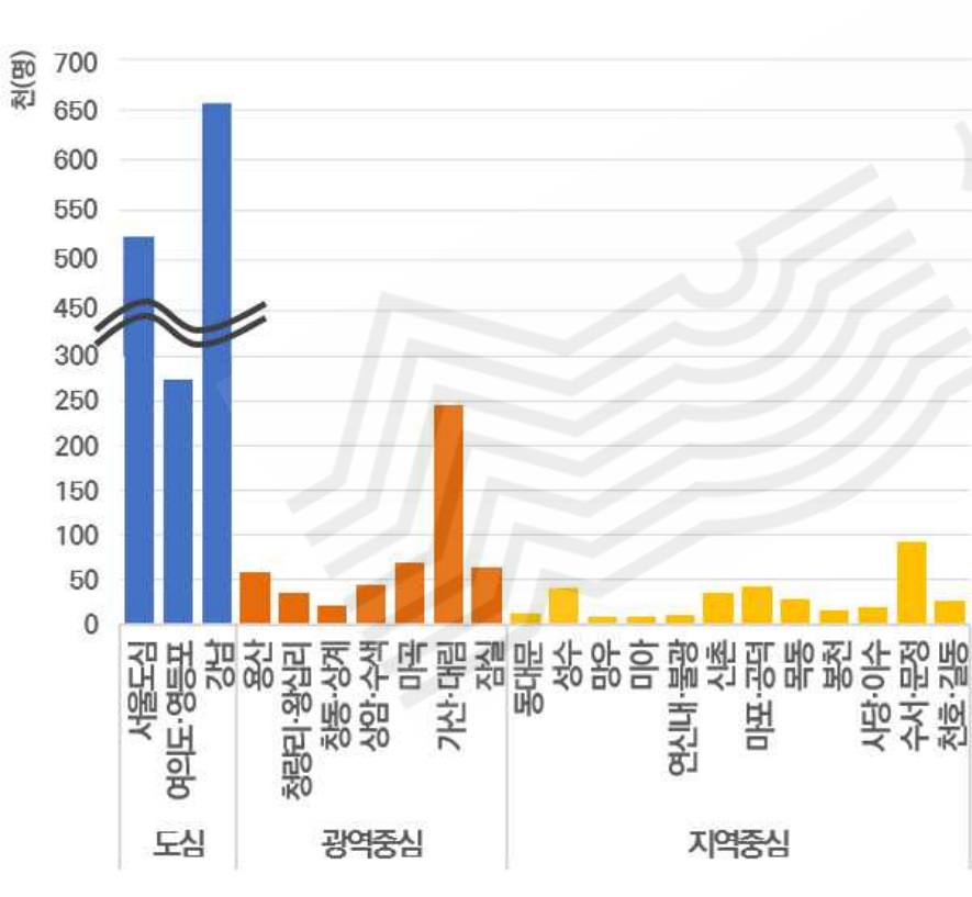 실제로 서울의 3도심(강남, 사대문, 여의도·영등포) 중에서 가장 많은 종사자수가 속한 곳은 강남입니다. 주간인구를 기준으로 했을 때에도 서초동, 역삼동, 논현동, 삼성동과 같은 강남 도심의 한복판에 있는 곳들이 가장 생활인구가 많습니다. 이는 강남 도심이 생활이동에 있어서도 가장 중심임을 뜻합니다.