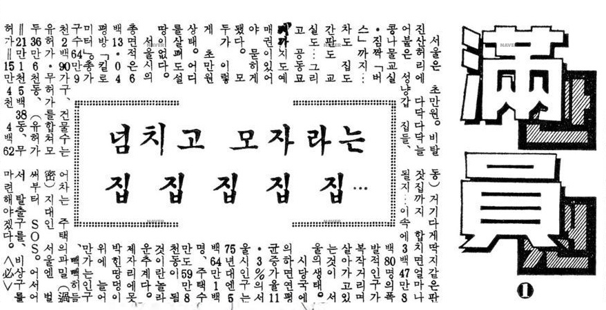 시간을 거슬러 올라가 1960년대, ‘남서울’이라는 단어가 등장하기 시작합니다. 지금의 강남 일대를 일컫는 이곳은 이미 과밀로 몸살을 앓고 있는 강북 도심의 인구와 기능을 분산할 지역으로 언급돼요. 당시 신문기사를 살펴보면 ‘만원’, ‘인구집중억제’와 같은 단어가 종종 보이죠.