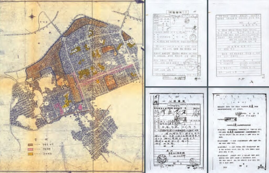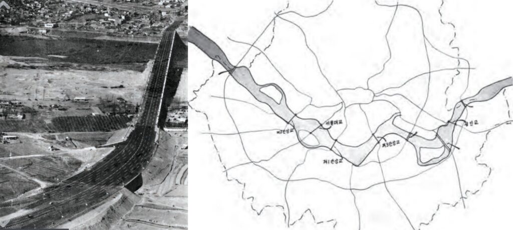경부고속도로와 한남대교의 건설은 당시로서도 막대한 재정이 투입되는 사업이었습니다. 동시에 토지를 확보하기 위해 토지구획정리사업이 추진되었습니다. 이는 비정형 또는 무질서한 형태로 형성된 필지를 정리하고 기반시설 계획을 세워 격자형으로 또는 지형과 용도에 맞게 시가지를 조성하는 사업입니다.