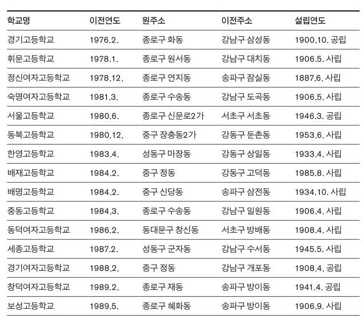 여기에서 등장한 것이 바로 명문 고등학교의 강남 이전 정책입니다. 이미 도서관으로 너무 익숙한 북촌의 정독도서관은 경기고등학교, 안국역 부근의 현대사옥은 휘문고등학교였고요. 서울고등학교는 원래 광화문과 서대문 사이 경희궁 자리에 있었습니다.