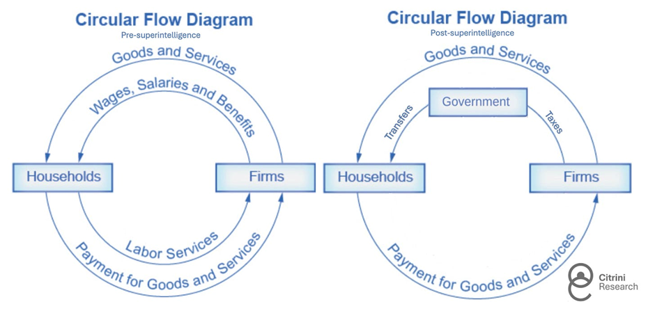 이 나선은 AI가 화이트칼라의 지능 노동을 대체해 기업이 비용을 줄이고, 그 절감분을 다시 AI(GPU)에 재투자하는 구조가 반복되며 소비가 구조적으로 붕괴되는 과정을 뜻합니다. 결국 기계가 생산한 막대한 부(Wealth)가 노동자들의 가계로 흘러 들어가지 않고, 다시 기계(Compute)의 몸집을 키우는 데만 쓰이는 ‘단절된 경제’가 도래한다는 전망이에요.