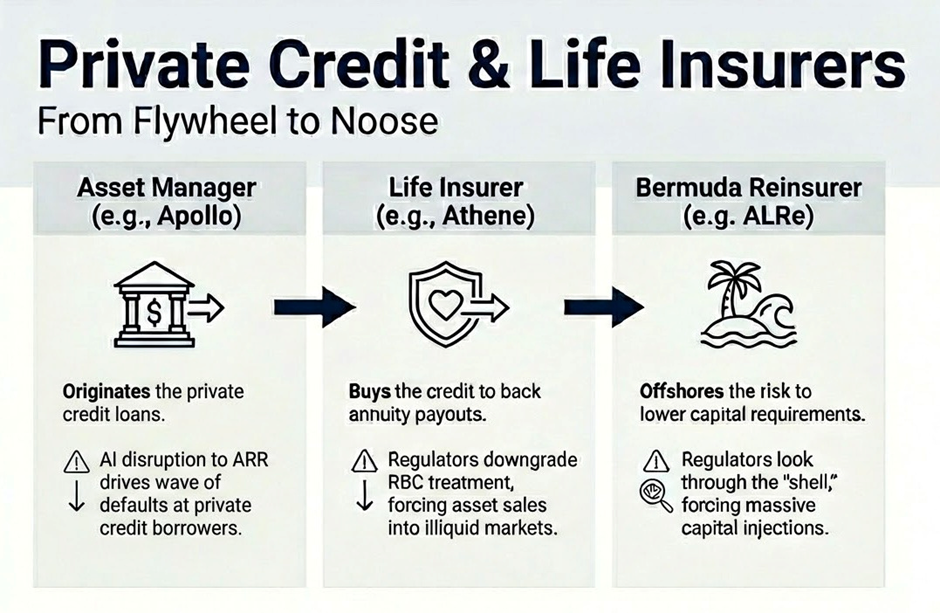 결국 SaaS 기업의 매출이 흔들리면, 이를 바탕으로 한 사모대출 자산의 가치가 훼손됩니다. 그리고 그 자산에 투자한 보험사의 건전성에도 압박이 가해집니다. 다시 말해, 젠데스크에서 시작된 균열이 사모대출을 거쳐 보험 자본으로 전이되는 경로가 만들어지는 것입니다. 시트리니는 바로 이 지점에서, 특정 기업의 부실이 금융 시스템 전반의 불안으로 증폭될 수 있다고 경고합니다.