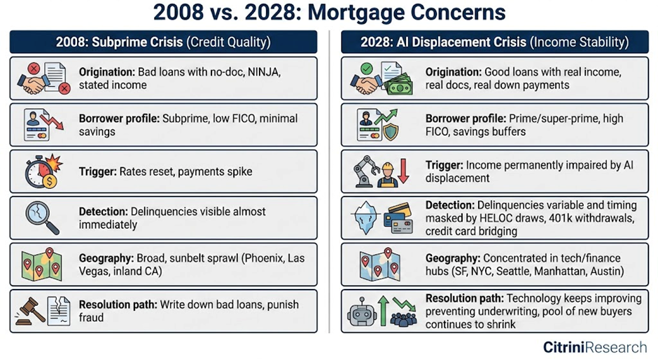 그러나 시트리니는 완벽한 AI 상담 에이전트가 확산되면서 이 구조 자체가 흔들리는 미래를 상정합니다. AI가 인간 상담 업무를 대체하고 고객지원 소프트웨어 수요가 급격히 줄어들면, 안정적으로 보였던 SaaS 기업의 매출 기반도 빠르게 약화될 수밖에 없습니다. 그리고 그 순간, 이를 바탕으로 형성된 대출의 담보력 역시 함께 훼손되기 시작합니다.