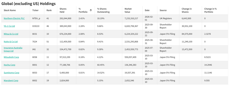 기관 투자자들의 13F 공시 자료를 집계하는 웨일위즈덤의 최신 자료에 따르면 2025년 4분기 기준 미국 상장 주식 자산이 약 2,741억 달러 규모를 형성하고 있는 상황에서 일본 내 총 투자 규모는 약 252억 6,300만 달러(약 37조 원)에 달하며 전체 포트폴리오의 약 8.43%를 차지하고 있습니다.