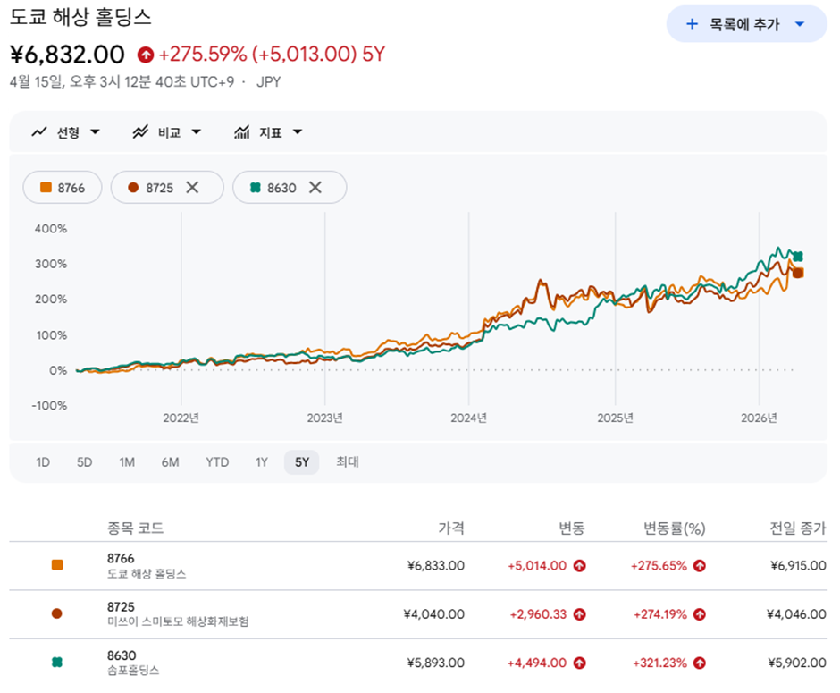 <일본 3대 메가 손보사(도쿄마린, MS&AD, 솜포) 최근 5년 주가 추이> 출처: Google Finance