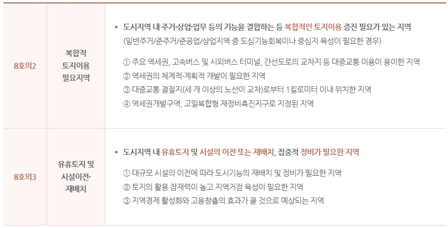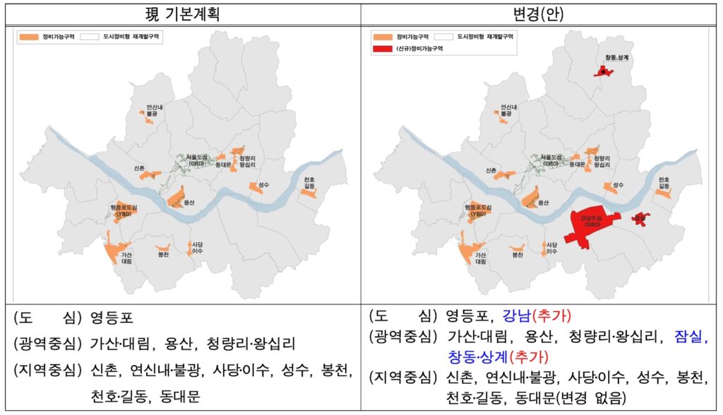 사대문을 비롯한 용산, 청량리, 영등포, 마포가 그동안 도시정비형 재개발 사업의 주요 대상이었다면 신촌, 연신내/불광, 사당/이수, 성수, 봉천, 천호/길동, 동대문과 같은 지역 중심지도 정비구역을 바로 지정할 수 있도록 대상의 폭을 넓혔습니다.