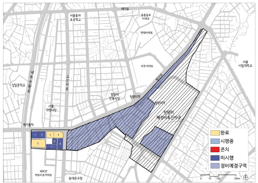 용산의 경우 용산역 전면에 위치한 아모레퍼시픽 사옥이나 주변의 주상복합 건물들이 모두 이 사업 유형을 적용하여 개발이 완료된 사례라고 할 수 있습니다. 청량리 역시 몇 년 사이 초고층 주상복합 밀집지로 변화했는데, 역시 동일한 사업 방식을 적용한 사례고요. 이미 개발이 완료된 역 주변은 물론이고 서쪽으로 확장하여 제기동역 주변으로도 도시정비형 재개발이 확대되고 있습니다. 영등포 문래동 일대 역시 같은 흐름이 이어지고 있습니다.