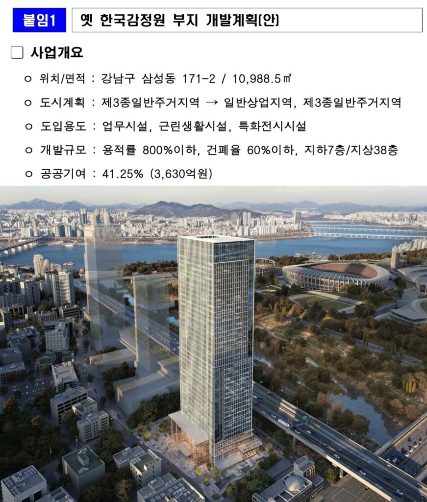 최근 사전협상이 완료된 삼성동 옛 한국감정원 부지 사례를 볼까요? 용도지역을 3종일반주거지역에서 일반상업지역으로 상향하고 업무/근린생활/전시시설을 도입하는 내용으로 개발계획이 확정되었습니다.