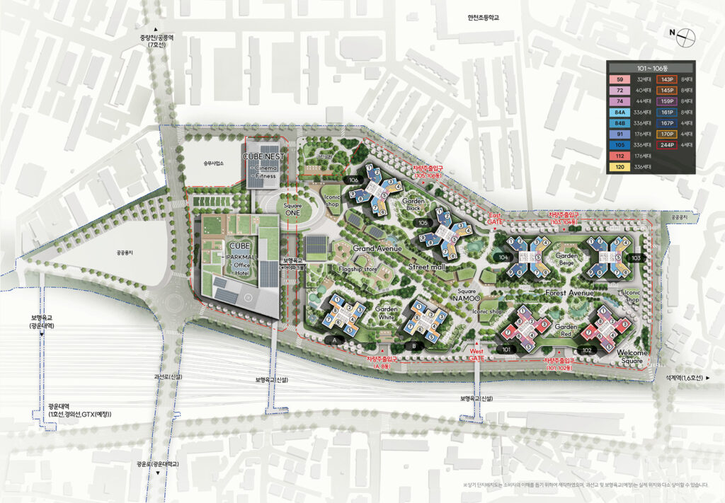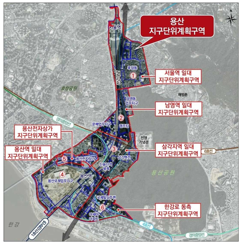100만 평이 넘는 규모로 서울역 주변부터 남영역, 용산역 주변과 용산국제업무지구까지 포함하는 용산지구단위계획구역은 용산의 중요성을 고려할 때 이렇게 광역적으로 지정하는 것이 불가피했습니다. 한편 개별 사업을 진행할 때마다 전체 구역에 대한 계획을 변경하는 번거로움이 있었기에, 6개 구역으로 분할 재편하기로 했어요. 워낙 구역이 방대한 만큼 안에 포함된 개별 사업의 추진 방식 역시 다양합니다. 앞서 언급한 용산역 주변의 도시정비형 재개발사업은 지구단위계획구역과 중복으로 지정되어 있습니다.