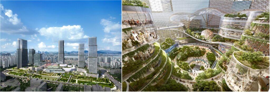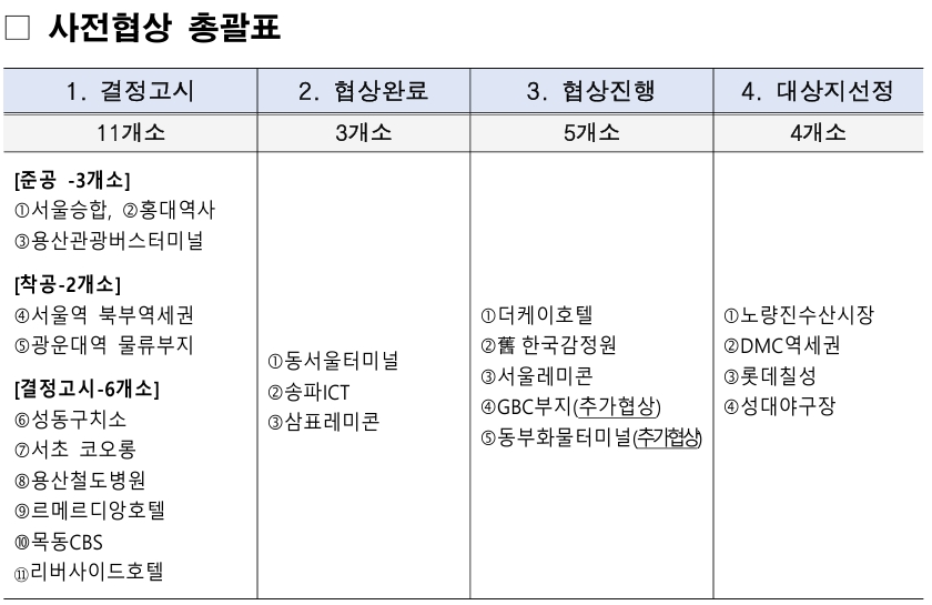 이미 사전협상이 완료되어 건축물이 준공까지 된 사례로는 용산역 후면 관광터미널 부지를 개발해 4개 호텔이 한꺼번에 생긴 서울 드래곤시티, 홍대 주변의 AK플라자 홍대가 있습니다. 광운대역의 철도부지를 개발한 서울원 아이파크는 주상복합 외에 업무, 문화, 숙박시설이 같이 복합용도로 계획됐습니다. 이런 용도는 사전협상을 통해 결정했고, 현재 공사 중입니다. 현대자동차그룹에서 추진 중인 삼성동 GBC(Global Business Complex) 역시 아직 공사 중이지만, 최근에 사전협상을 완료한 사례입니다.