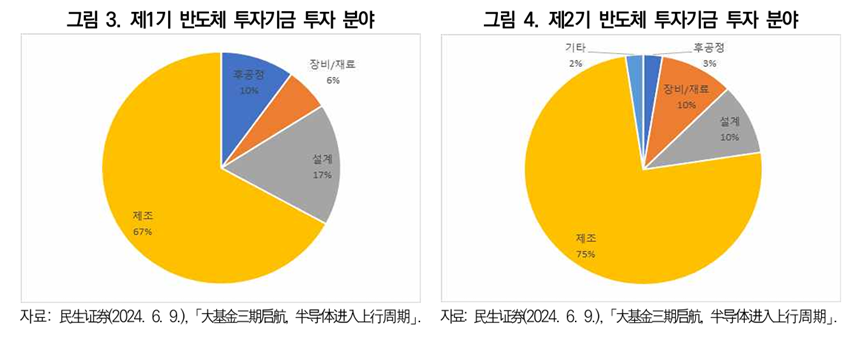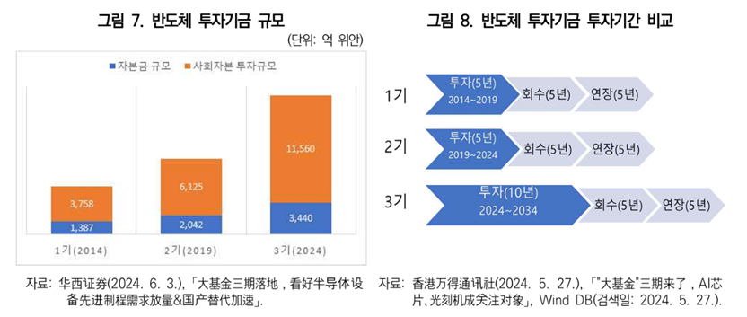 이 중 가장 최근에 조성된 3기 펀드는 1기와 2기 펀드의 자금을 합친 컷보다 훨씬 큰 규모입니다. 게다가 중국 재정부만이 아니라 공상은행, 농업은행, 중국은행 등 6대 국유 상업은행이 출자에 참여했죠. 그리고 이 거대한 규모의 펀드는 반도체 제조 분야, 특히 미국의 제재로 인해 취약한 고리가 된 반도체 장비와 소재, AI 칩 분야에 집중 투자할 예정입니다.